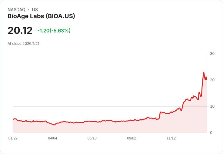 臨床階段生物製藥公司BioAge Labs(BIOA)近日宣佈其上調的公開發售計劃,以每股19.50美元的價格出售約5.9百萬股股票,目標總金額達到1.15億美元。此次募資預計將在2026年1月23日左右完成,承銷商還擁有30天內購買額外884,600股的選擇權。