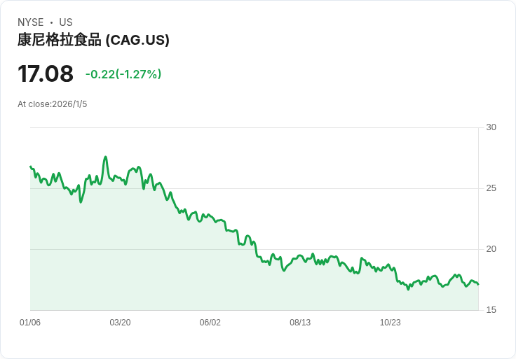 Conagra Brands, Inc.(NYSE:CAG)近日受到市場關注,威爾斯法戈於1月5日將其目標價從19美元下調至18美元,並維持「平衡評級」。這一變動源於對2026年飲料、食品及家庭護理市場模型的更新。儘管在12月時,Conagra仍保持全年的銷售和利潤預期,但第二季度的低迷表現讓人擔憂,尤其是面對消費者支出壓力及激烈競爭。