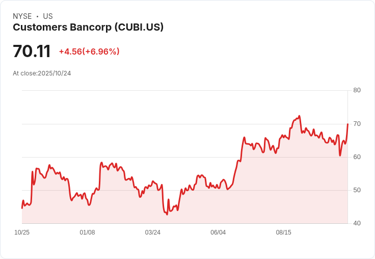 在市盈率14.4倍的背景下,Customers Bancorp的股價目前為70.11美元,遠低於其估算公允價值134.4美元,這使得公司潛在的底線表現和成長軌跡備受矚目。隨著銀行業務效率比率的提升及對自動化技術的持續投入,Customers Bancorp正逐步改善成本結構,並提高運營槓桿。