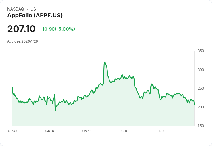 AppFolio(APPF)在週五早盤交易中,股價驟降8%,原因是該公司發布的2026年指引未能滿足市場期待。儘管第四季度業績超出預期,但其預測的收入範圍為11億至11.2億美元,略低於市場共識的13億美元。Piper Sandler 的分析師表示:「我們理解投資者對缺乏具體目標和框架以增強業務透明度的失望,但我們認為此次拋售過度。」他們指出,第四季度的單位增長率已加速至每年8%,而核心平均收入也因高級產品層的採用而有所提升。