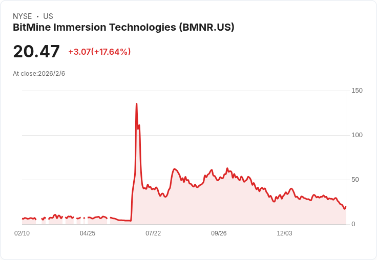 在加密貨幣市場震盪之際,Bitmine Immersion Technologies (BMNR) 本週一宣佈,其以太坊(ETH)持有量已達到 4,325,738 枚,當前價值約為 9.23 億美元,顯示出公司對於該虛擬貨幣的強烈信心。根據最新報告,Bitmine 的整體資產包括 193 顆位元幣(BTC)、對 Beast Industries 的 2 億美元投資、對 Eightco Holdings 的 1900 萬美元投資,以及現金儲備高達 5.95 億美元,使得其總資產估計達到 100 億美元。