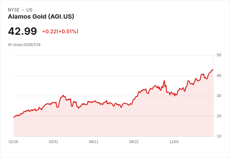 在最新的財報中,阿拉莫斯金礦(Alamos Gold, AGI)宣佈其2025年的黃金產量為545,400盎司,同比下降3.8%,未能達到修正後的指導範圍560K-580K盎司。這一訊息使得公司股價在週四交易中下跌了6.7%。