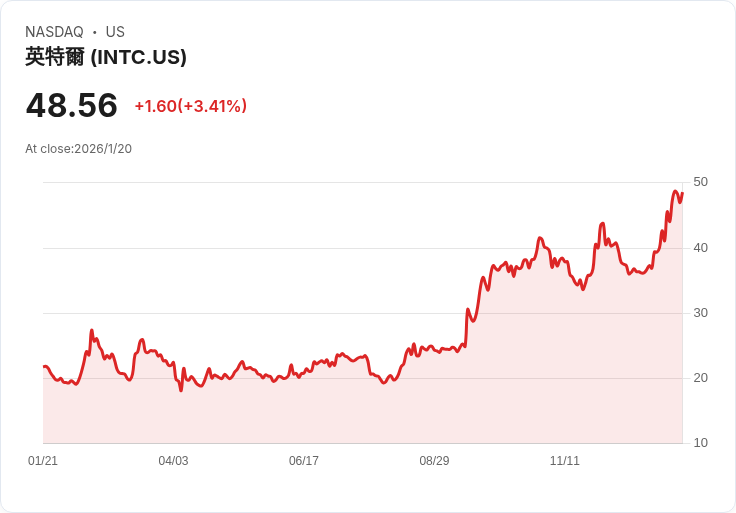 英特爾(NASDAQ: INTC)在週二以每股48.56美元收盤,上漲3.41%。此波漲勢主要受到多家券商對其股票的上調評級影響,市場也密切關注即將公佈的第四季度財報及指引,以確認AI驅動的伺服器中央處理器(CPU)需求是否正在改善。當日交易量達到1.45億股,較三個月平均值93萬股高出約56%。