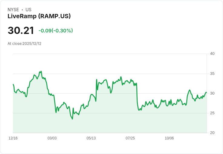 LiveRamp Holdings (RAMP) 近期股價表現引發投資者關注。儘管基本面持續改善,但股價卻在30美元附近徘徊,使人質疑市場是否低估了這家公司的增長潛力與資料合作優勢。在過去90天內,其股價上漲了14.09%,顯示出一定的動能重建,然而一年來的總股東回報仍略為負值。