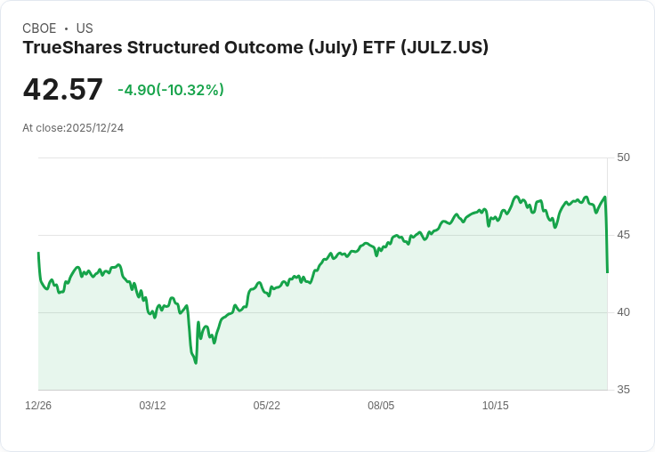 Trueshares Structured Outcome (July) ETF(程式碼:JULZ)近日引起市場關注,因其宣佈將於2025年12月26日向股東支付每股2.59美元的年度分紅。根據公告,登記股東日期為2025年12月24日,而除息日同樣設在該日。這一訊息顯示出該基金在提供穩定回報方面的承諾,吸引了不少投資者的目光。