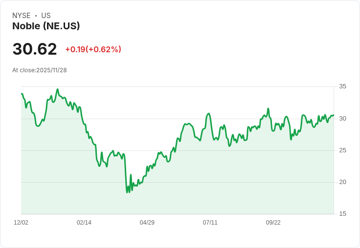 根據折現現金流(DCF)模型,Noble目前的自由現金流為3.44億美元,預計到2027年將增長至約4.77億美元,而2035年有望達到7.91億美元。這表明Noble的內在價值每股可達79.29美元,與當前股價相比,有61.4%的折扣,暗示其可能被低估。