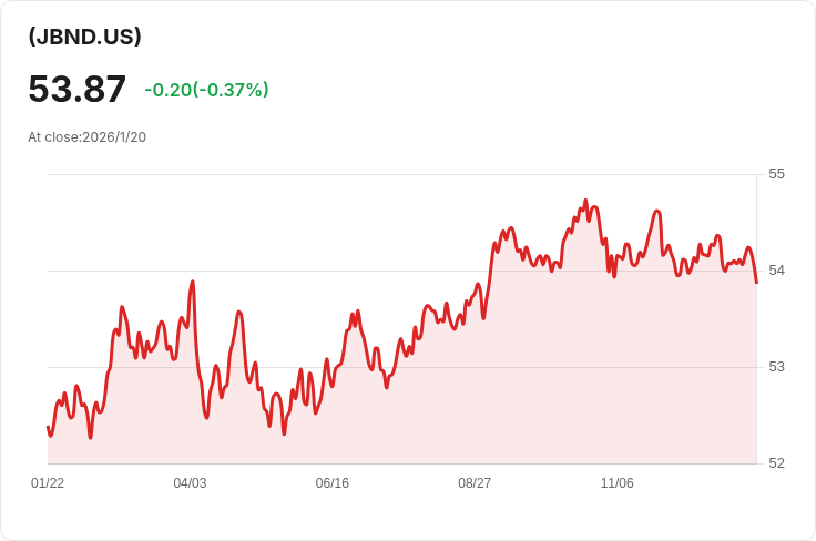 JBND是一隻主動管理的債券ETF,旨在透過多元化的固定收益投資來超越彭博美國綜合債券指數,並提供4.5%的股息收益率。根據最新資料,截至2026年1月20日,JBND的每股價格為53.87美元,過去一年上漲7.4%。儘管表現稍遜於標普500指數,但其穩健的回報和相對較低的費用比例(0.25%)使得它成為追求固定收益投資者的一個理想選擇。