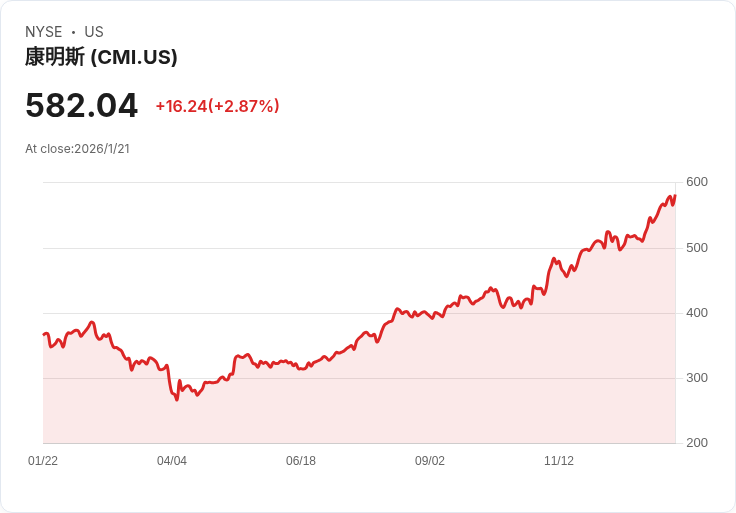 Cummins股價在過去一年內上漲62%,目前每股約582美元,分析其估值及未來潛力。