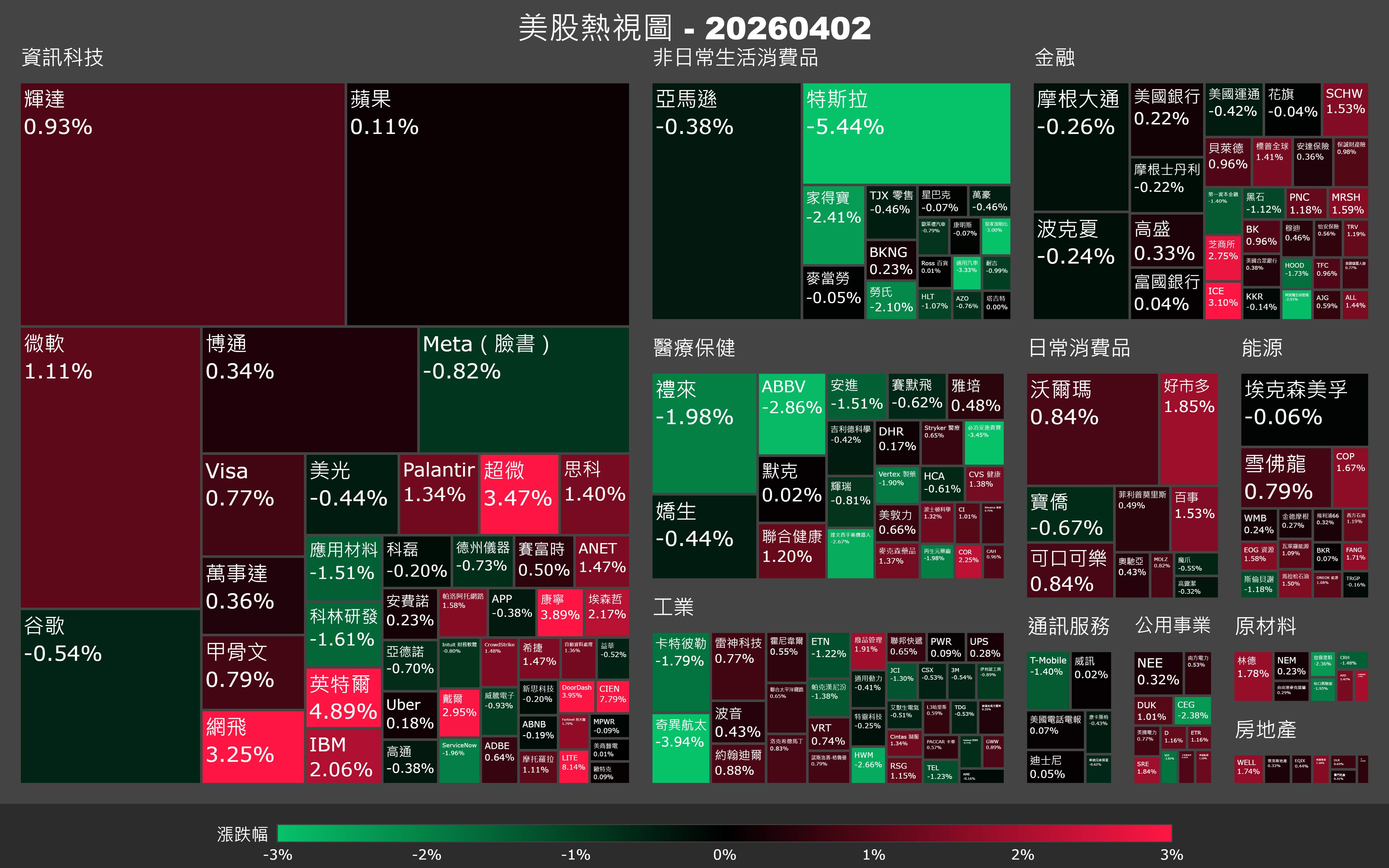 當日最大的壓力來自特斯拉(TSLA),股價重挫5.44%,原因是第一季度交付量正式公布後不如市場預期,引發投資人大舉出走。此外,ARM Holdings(ARM)跌3.84%、荷商艾司摩爾(ASML)跌3.13%、科林研發(LRCX)跌1.61%,拖累半導體設備類股表現。台積電ADR(TSM)也收跌0.72%至339.04美元,Meta則跌0.82%收574.46美元。