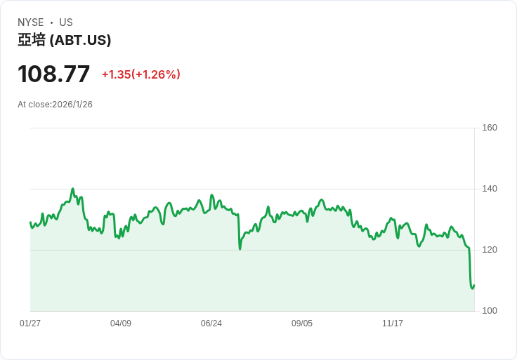 艾伯特實驗室(Abbott Laboratories, ABT)在連續六個交易日的跌勢後,終於迎來反彈,周一股價上漲1.2%,收於108.77美元。這家醫療技術巨頭自1月15日以來開始了下行趨勢,在此期間股價累計下跌超過13%。整個一月份,該公司僅有三個交易日呈現上漲,其餘12個交易日均為下跌。