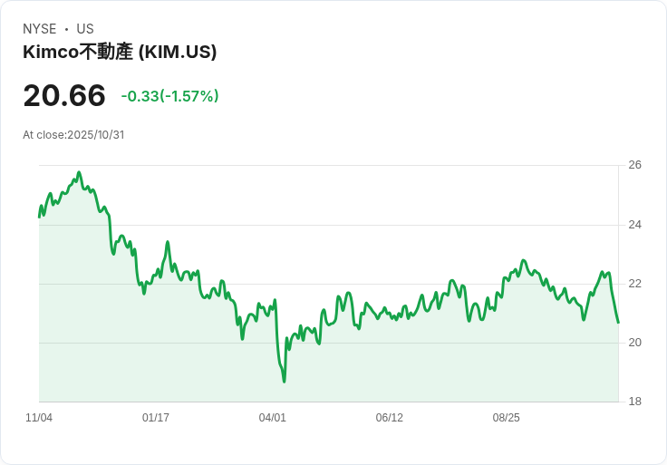 Kimco Realty Corporation是一家專注於開放式購物中心的房地產投資信託基金(REIT),其投資組合主要由雜貨店錨定的零售中心組成。公司致力於透過戰略性收購、重建和創新技術來提升其資產價值和租金收入。Kimco以其穩健的財務狀況和靈活的資本配置策略而聞名,並持續尋求機會以提高股東價值。