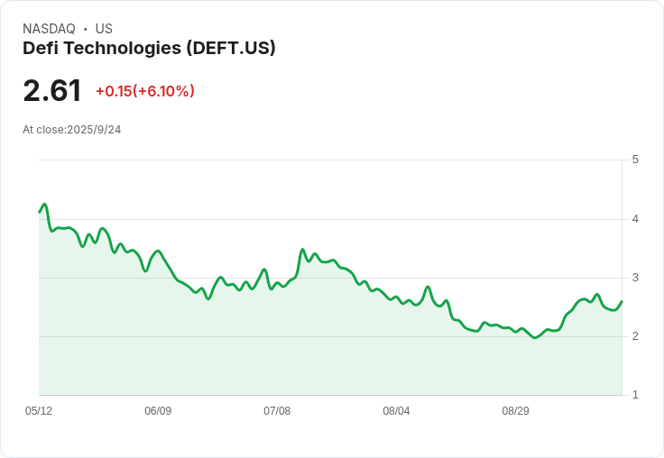 DeFi Technologies 與多家機構投資者達成協議,發行普通股及認購權證,募得 1 億美元,但股價在盤前交易中下滑。