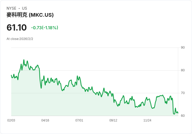 麥可美公司(McCormick & Company, Incorporated, NYSE:MKC)近日受到巴克萊的關注。該行分析師安德魯·拉札(Andrew Lazar)在最新報告中將其目標股價從72美元調整為67美元,並維持「平等權重」評級。隨著第四季財報的出爐,公司管理層已透露可能會在2026財年選擇保護銷量,而非追求短期利潤增長。