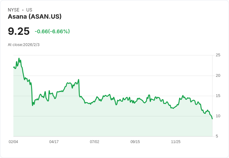 Asana(ASAN)近期因股價持續下滑而受到關注,過去一年及三個月的負回報使得投資者開始重新評估這家工作管理軟體供應商。當前股價為9.25美元,顯示出30天內上漲28.63%,但一年總股東回報卻下降了57.82%。這一情況反映市場對其增長前景和風險概況的再思考。
