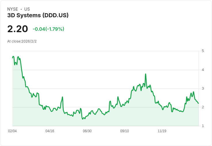 3D Systems (DDD) 的股價在週二下午再次下滑2.73%,至每股2.14美元,這是該公司自1月23日以來的第八個交易日持續下跌。當時股價因為暴跌6.71%而開始了下行趨勢。在隨後的幾天中,DDD 股價從高點回落超過16%。根據市場評級機構的分析,DDD 獲得「強烈賣出」的評級,總分僅有1.44(滿分5)。雖然近期有分析師對其成本節省計劃表示樂觀,但基本面仍顯示出公司的弱勢,近五年內營收持續下降。最新財報顯示,第三季度營收同比減少19.2%,僅達到9120萬美元,未能符合預期。儘管管理層希望到年底實現5000萬美元的年度化節省目標,但投資者對於能否在2026年第一半實現正向經營現金流仍存疑慮。若無法改善基本面,DDD 未來或將繼續承受壓力。