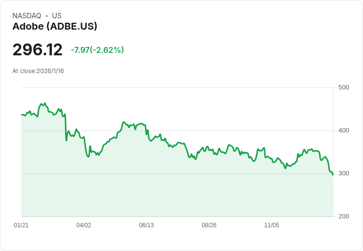 Adobe(ADBE)近期股價持續走低,在週二的交易中再跌1.35%,報292.13美元,這是該公司股價連續第七天下滑。從1月9日至16日,Adobe股價累計下跌11.33%,而同期標普500僅微幅下降0.38%。分析師指出,隨著競爭加劇及成長放緩,Adobe正面臨前所未有的挑戰。