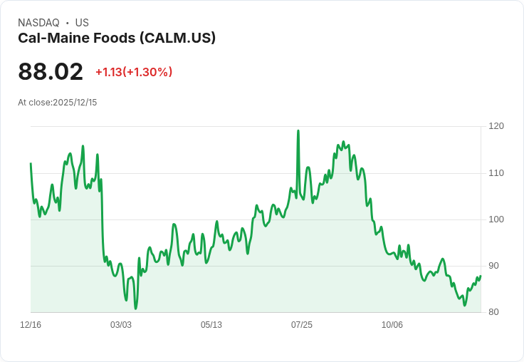 加州美食公司(Cal-Maine Foods, CALM)近期宣佈任命Johnathan Zoeller為其準備食品部門的新財務長,此舉旨在將公司的歷史性盈利與新的財務領導力相結合,專注於更高利潤的增值產品。儘管目前股價88.02美元反映了短期內的穩健回報,但年初至今的表現卻較弱。然而,該公司過去三年及五年的總股東回報率顯示出其長期增長勢頭依然強勁。