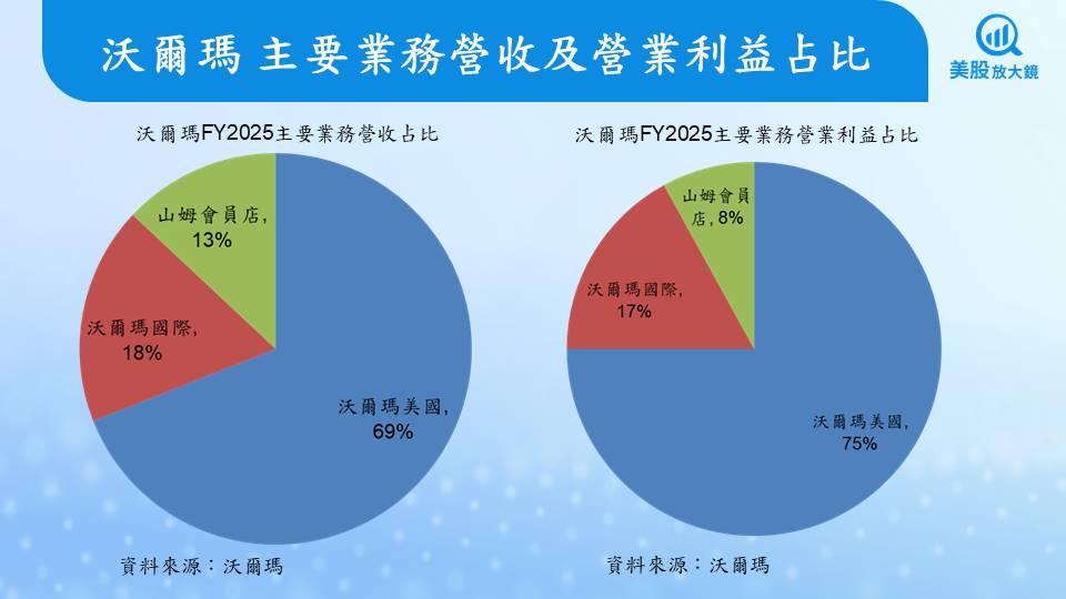 沃爾瑪將其業務劃分為三大部門:沃爾瑪美國、山姆會員店(Sam's Club)和沃爾瑪國際(Walmart International)。在FY2025,沃爾瑪美國部門的營收佔比達69%,其次為沃爾瑪國際的18%和山姆會員店的13%。值得一提的是,沃爾瑪美國不僅是規模最大的部門,其獲利能力也最強,貢獻了公司總營業利益的約四分之三,利潤率高於其他兩大部門。預期美國業務將持續扮演公司的獲利核心,而沃爾瑪國際業務則被視為長期的成長潛力所在。沃爾瑪主要競爭對手包括亞馬遜(AMZN)、目標百貨(TGT)與好市多(COST),其中亞馬遜與沃爾瑪在業務模式相似性以及在電子商務和雜貨市場的競爭激烈;好市多與沃爾瑪旗下的山姆會員店都是會員制量販店的主要競爭對手;而目標百貨則與沃爾瑪美國的業務模式類似,兩者都提供雜貨和非必需品,直接爭奪相同的消費客群。更詳細的比較請參閱【美股焦點】目標百貨(Target) 數位轉型見曙光,長線投資價值浮現?一文。