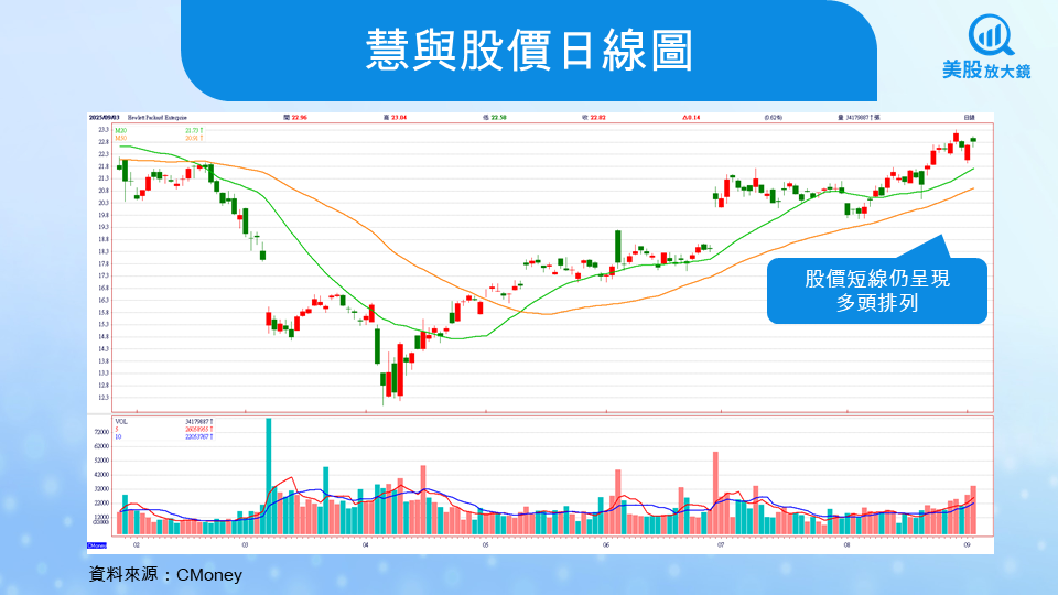從技術面來看,慧與股價目前仍維持在短期均線之上,呈現多頭排列,顯示市場對未來基本面仍抱持信心。從基本面來看,公司正站在 AI、網路與雲端 三大趨勢的交會點,長期轉型方向清晰。若伺服器毛利率能逐步回升至歷史水準的 10% 左右,並加速 Juniper 整合帶來的成本協同與市場擴張效益,中長期的獲利結構將有望改善,估值也具備重估的空間。