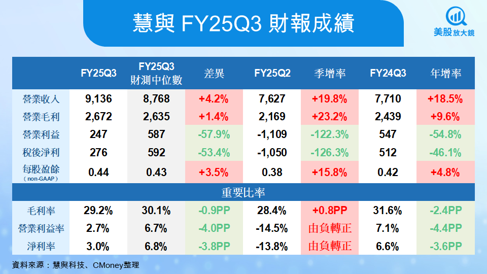 慧與在 FY25Q3 繳出歷史新高的成績,營收達 91 億美元,年增 18.5%,顯著優於市場預估的 87 億美元。Non-GAAP EPS 為 0.44 美元,同樣高於分析師預期的 0.43 美元。毛利率為 29.9%,雖然比上一季改善 0.8 個百分點,但仍較去年同期下滑 1.9 個百分點,顯示營收擴張的同時,獲利能力仍面臨挑戰。