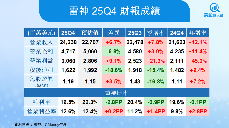 雷神在 2025 年第四季度的財務表現極為穩健,多項核心指標均優於市場預期 。
