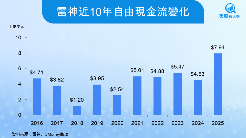 現金流表現是本次財報的一大亮點。25Q4 營運現金流高達 42 億美元,扣除 10 億美元的資本支出後,自由現金流(FCF)達到 32 億美元 。回顧 2025 全年,自由現金流總額達 79 億美元,比 2024 年大幅增加 34 億美元,這為公司的資本配置與未來研發投入提供了充足的底氣 。