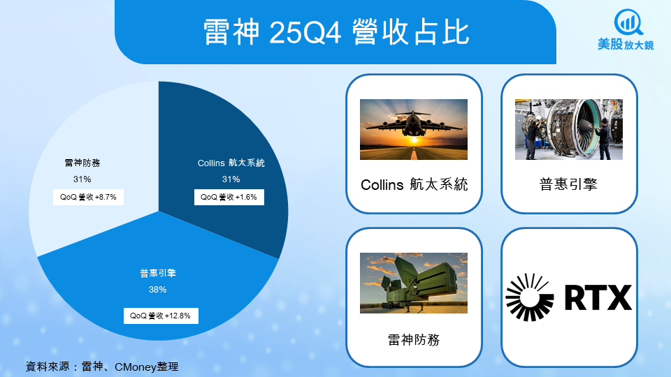 雷神的三大業務板塊——普惠(Pratt & Whitney)、柯林斯航太(Collins Aerospace)與雷神(Raytheon)——在 25Q4 均展現了各自的轉型成效與市場競爭力。