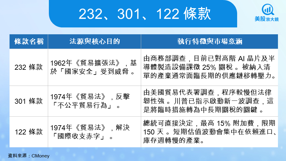 適用於國際收支或貿易赤字情境,可對進口加徵最高 15% 附加費,原則上最長 150 天,延長需國會同意。它的投資意涵在於「短期稅率看得到、長期政策看不到」,因此估值波動通常會放大在依賴進口成本、庫存週轉、以及定價權較弱的產業。
