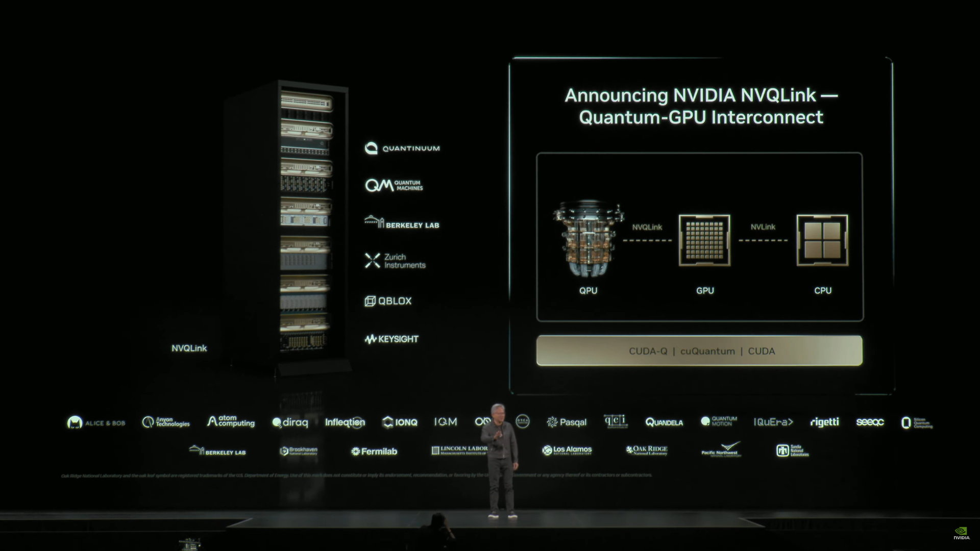 在這場發表中,最令科學界興奮的,是輝達發布了 NVQLink。這是一套讓 GPU 能與量子處理器(QPU)直接互聯的開放式架構。它的目標不是造量子電腦,而是打造「橋樑」,把量子與古典晶片運算連成一體。