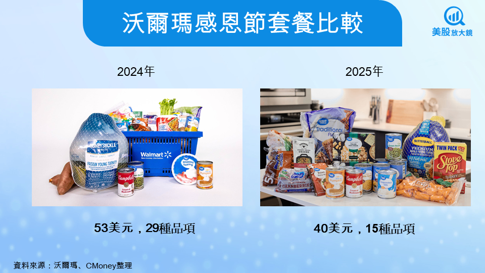 今年感恩節前夕,美國總統川普將焦點放在「生活成本」上,他多次公開宣稱,美國正在成功壓低物價,並以沃爾瑪(WMT)推出的 40 美元感恩節套餐為例,強調比去年便宜 25%。這番說法乍聽誘人,但迅速受到媒體與分析師的質疑。實際比對後發現,套餐內容大幅縮水才是「降價」的真正原因。今年的餐籃品項從 29 種壓縮到 15 種,部分傳統菜色如地瓜、山核桃派、芹菜與棉花糖等完全消失,多數知名品牌也被更低價的自有品牌取代。即使用同樣商品組合重新計算,降幅也只有 6% 至 7%,遠不及川普宣稱的四分之一。這場「最便宜的感恩節」更像是行銷策略,而非反映通膨真正降溫。