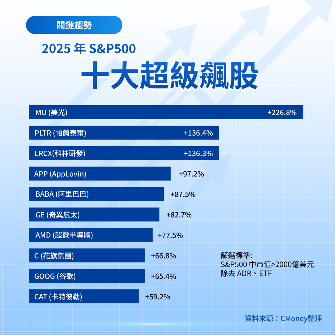2025 年的美股行情,並非全面牛市,而是一場高度集中的結構性重估。本篇整理 10 檔 S&P 500 成分股、市值均超過 2,000 億美元,且在 2025 年股價表現名列前茅的「超級飆股」,回頭檢視它們各自上漲的理由,並判斷哪些動能具有延續性,2026 年是否能再創新高。