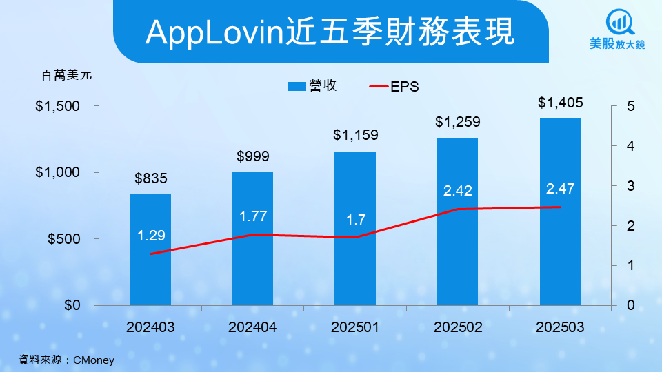 拋開做空機構的紛擾,回歸基本面檢視,AppLovin 的財務表現展現了令人驚嘆的爆發力。根據最新的 2025 年第三季財報,公司營收年增率高達 69%,顯示其成長動能並未減弱 。更令人印象深刻的是其獲利能力的躍升,每股盈餘(EPS)幾乎翻倍,從 1.25 美元增至 2.45 美元,而調整後的 EBITDA 利潤率更是擴大至 82% 的驚人水準 。