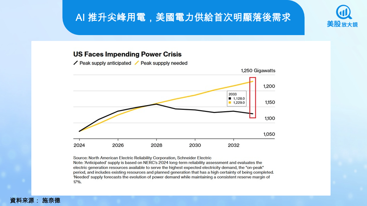 真正浮現的壓力,並不只是總發電量是否足夠,而是尖峰時刻能否把電準時送上線。從北美電網可靠性機構(NERC)的長期評估來看,未來幾年「可預期的尖峰供給」已開始明顯落後於「維持系統穩定所需的尖峰電力」,且缺口隨時間擴大。這代表即便名目上的發電容量仍在增加,實際可在關鍵時點動用的電力,已逐步無法跟上需求成長。
