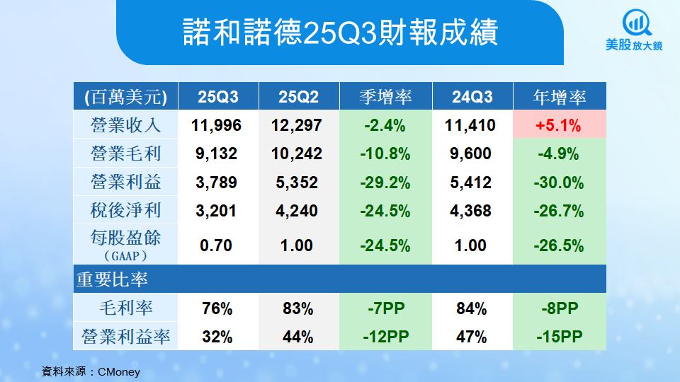 從數據來看,諾和諾德在 25Q3 已率先顯露壓力。單季營收季減約 2%,年增幅度僅約 5%;更關鍵的是,毛利率從前一季的 83% 下滑至 76%,營業利益率同步從 44% 大幅降至 32%。即使營收仍有年增,獲利端已出現明顯壓縮,反映價格競爭與折讓開始實質侵蝕財務結構。