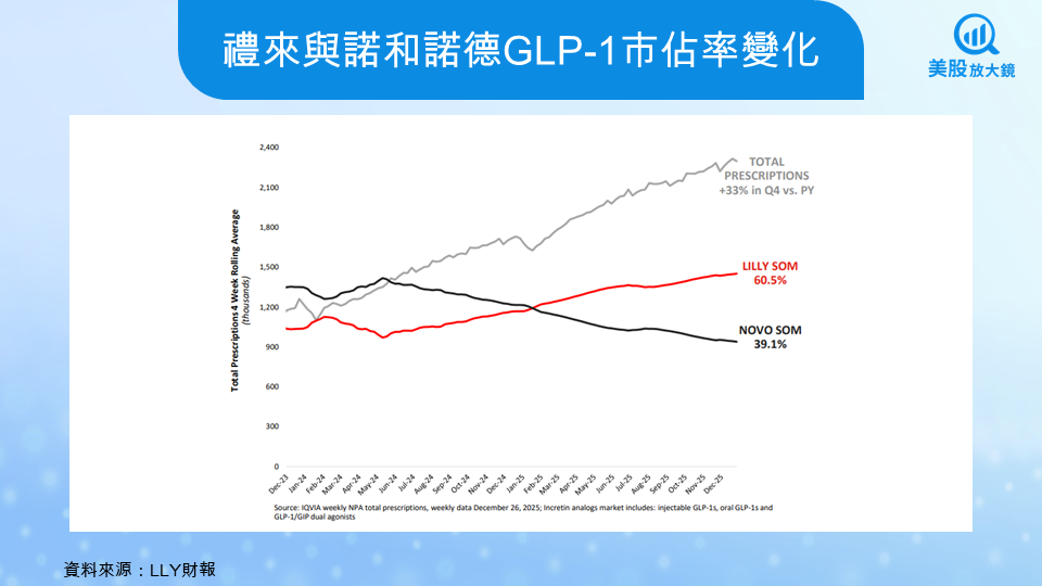 從 25Q4 財報與市佔率變化來看,禮來的成長邏輯已相當清楚:在實現價格下行的背景下,公司選擇以放量換取規模,且效果已反映在營運數據與市佔率結構上。