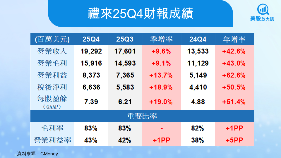 根據財報數據,25Q4 單季營收為 192.9 億美元,年增 42.6%,同期稅後淨利年增 50.5%,GAAP 每股盈餘達 7.39 美元,年增 51.4%。更關鍵的是,在營收快速成長的同時,毛利率仍維持在 83% 的高檔水準,營業利益率則提升至 43%,顯示價格讓步並未侵蝕核心獲利結構。