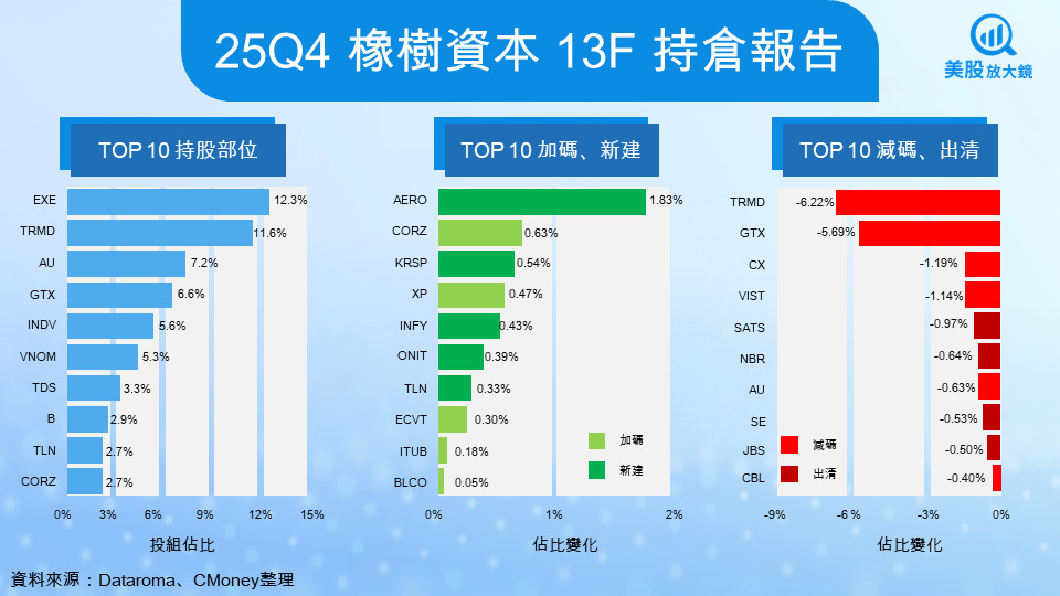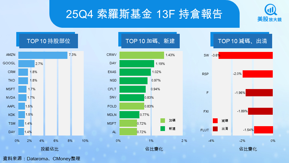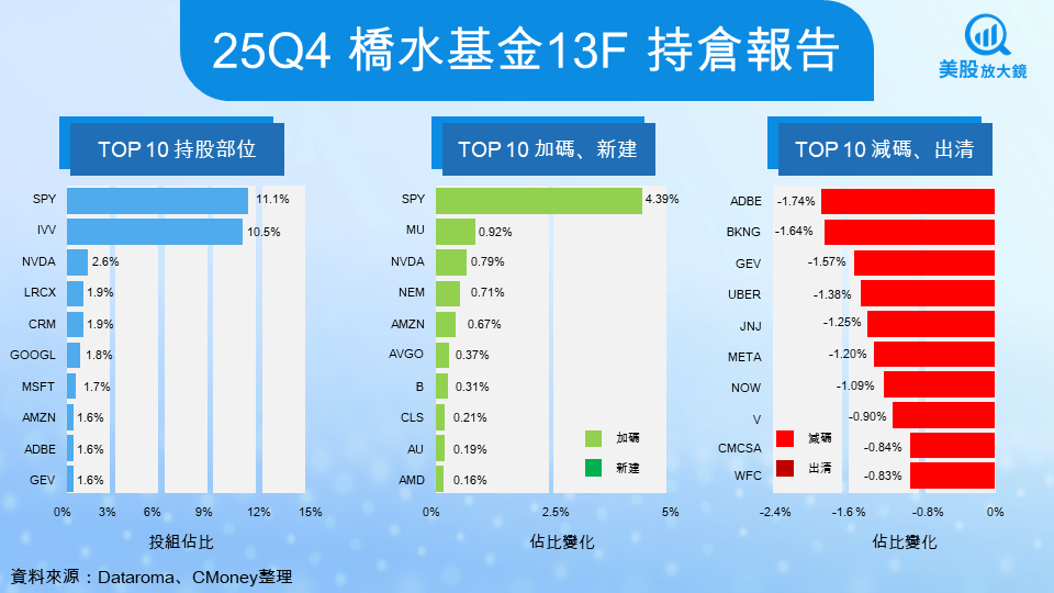 AI 投資進入「汰弱留強」的洗牌期: 雖然 AI 依然是市場熱點,但機構大師們不再盲目「全買」,而是精確挑選贏家 。例如,輝達(NVDA) 依然是眾多機構的寵兒,橋水、阿帕盧薩與索羅斯都在加碼,顯示對算力龍頭的高度認可 。同時,機構也展現了明顯的換血動作,例如阿帕盧薩清倉英特爾(INTC) 並轉投超微(AMD) ,顯示資金正從廣泛佈局轉向垂直領域的硬體優勢股 。押注「消費韌性」與「週期性復甦」: 機構開始佈局實體經濟中的優質標的 。在民生消費方面,波克夏新買入達美樂(DPZ) ,顯示預期消費者支出將回流至具備品牌溢價的龍頭 。此外,AI 帶動的硬體升級使記憶體週期進入爆發期,阿帕盧薩與橋水便同時看好並加碼美光(MU) 。高度重視「防禦性」與「現金穩定性」: 在美股高檔震盪之際,大師們都在留後手 。波克夏將現金儲備推升至創紀錄的水準,並買入具備穩定收益的實體資產 ;橋水在買入 AI 的同時,也同步增持黃金(NEM) 以對沖宏觀經濟波動風險 ;橡樹資本則堅持配置基礎設施與金融債權以鎖定穩定現金流 。盤點五大機構的操作重點 波克夏(Berkshire Hathaway): 橋水基金(Bridgewater Associates): 重壓 AI 領頭羊: 資金聚焦記憶體與輝達生態系,橋水大舉加碼美光(MU) 與輝達(NVDA) ,這使得輝達躍升為投組第三大持股,佔比 2.6%。同時,也顯著增持了亞馬遜(AMZN) 。減持部分科技巨頭: 將資金由部分科技股與其他產業轉出。減碼最顯著的科技巨頭為 Adobe(ADBE) ,持股佔比大幅下降 1.74%;同時也減碼了叫車平台 Uber(UBER) ,下降 1.38%,與臉書(META) ,下降 1.20%。增持黃金避險與大盤 ETF: 在重倉科技股的同時,橋水也佈局金屬礦業,增持紐蒙特黃金(NEM) ,持股佔比增加了 0.71% 作為對沖。值得注意的是,其該季最大幅度的加碼其實是標普 500 ETF(SPY) ,佔比激增 4.39%,這也讓 SPY 穩居其第一大持股,佔比達 11.1%。阿帕盧薩(Appaloosa Management): 強力押注記憶體週期與佈局南韓: 傳奇投資人泰珀(David Tepper)對週期性爆發極具信心 他在 25Q4 狂加碼美光(MU) ,投組佔比大幅增加了 4.17%,使其躍居第四大持股,佔比 6.3%。同時,他也大幅新建倉了南韓 ETF(EWY) ,佔比達 2.66%,為該季第二大加碼/新建重點。科技股的加碼與「修正」: 在科技股操作上,大舉加碼了臉書(META) ,佔比增加 2.22%,與 Google(GOOG) ,佔比增加 1.83%,這兩檔目前分別位居投組第五大(5.8%)與第二大(8.2%)持股。超微(AMD) 則遭到大幅減碼,佔比下降 1.96%,為該季第二大的減碼標的(屬於獲利了結 );同時,也出清了 Fiserv(FISV) 與 Truist Financial Corporation(TFC) 。廣泛減碼中概股,但核心地位不變: 持續降低中國資產曝險,第一大減碼標的為阿里巴巴(BABA) ,佔比下降 2.81%,同時也減碼了KraneShares CSI China Internet ETF(KWEB) 、百度(BIDU) 與京東(JD) 等中概相關標的。不過,即便遭遇大幅減碼,阿里巴巴(BABA) 的佔比仍高達 11.0%,依然穩坐阿帕盧薩的第一大重倉股。索羅斯基金(Soros Fund Management): 防禦避險與精準新建倉: 因應避險情緒升溫,索羅斯新建了黃金開採商 New Gold(NGD) ,佔比增加了 0.97%。此外,該季資金也精準湧入其他新標的,前三大加碼與新建倉分別為:加碼 CoreWeave(CRWV) 、新建 Dayforce(DAY) 以及新建 Exact Sciences Corporation(EXAS) 。大幅減碼與出清特定資產: 該季最大幅度的減碼為 Smurfit Westrock plc(SW) ,持股佔比大幅下降 3.6%,同時也減碼了標普 500 等權重 ETF(RSP) ,下降 2.0%,與 飛特娛樂(FLUT) ,下降 1.54%。在清倉上,則完全出清了福特汽車(F) 以及中國大型股 ETF(FXI) ,顯示其正在調整傳統產業與海外市場的曝險。橡樹資本(Oaktree Capital): 維持防禦性價值佈局與高度集中: 橡樹資本維持其穩健部署,且持股高度集中。前兩大重倉股 Expro Group Holdings N.V. (EXE) ,佔比 12.3%,與托姆輪船(TRMD) ,佔比 11.6%合計就佔了近四分之一的投組;前五大還包含盎格魯黃金阿散蒂(AU) 、英德維爾(INDV) 、GTX(GTX) ,印證了其以能源、基礎設施與特定價值資產為主的佈局策略。精準新建倉與加碼: Talen Energy(TLN) 為該季的「新建倉」重點,已躋身投組第九大持股。此外,該季最大幅度的資金投入為新建倉Aerovate Therapeutics, Inc. (AERO) ,同時也加碼了核心科學公司(CORZ) 。大幅減碼與出清以控管風險: 橡樹資本透過大幅減碼來降低單一資產的集中度風險。前兩大減碼標的正是其核心重倉股托姆輪船(TRMD) 與GTX(GTX) 。在清倉方面,該季則完全出清了 JBS(JBS) 與 CBL(CBL) 等部位。投資人該如何觀察機構投資的動向 在參考這些華爾街巨鯨的動向時,投資人必須留意 13F 報告的先天滯後性。13F 報告規定機構需在每個季度結束後的 45 天內提交。換言之,我們在 2026 年 2 月中旬看到的這份報告,反映的其實是機構在 2025 年 12 月 31 日的持倉快照 。 在這一個半月的時間差內,總體經濟環境、企業財報表現或股價可能已經發生了劇烈變化。機構完全有可能在第一季已經獲利了結或改變策略。因此,13F 報告應被視為了解大資金「中長期產業趨勢判斷」的參考依據,而非直接無腦跟單的短期買賣訊號。