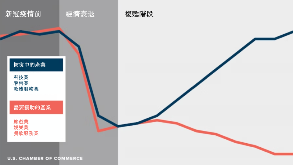 - 產業面:科技、雲端、醫療、零售等遠距相關行業快速復甦;旅遊、航空、娛樂仍艱困。