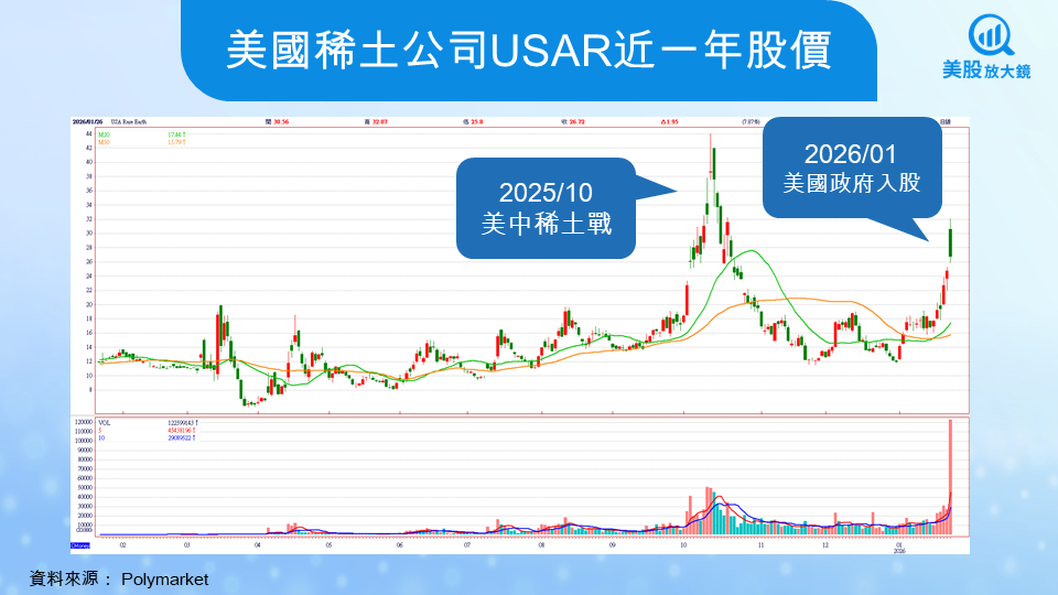 這段漲勢可拆解為兩個重估階段。第一階段出現在 2025 年下半年,市場逐步消化公司完成中游金屬與合金能力布局後,對其「從礦到磁鐵(mine-to-magnet)」垂直整合模式的可行性重新評價。第二階段則發生於 2026 年初,隨著美國政府擬提供 約 16 億美元 資金支持的合作意向書曝光,投資人開始將 USAR 從政策題材型稀土公司,重新定位為具備國家級專案屬性的工業平台。