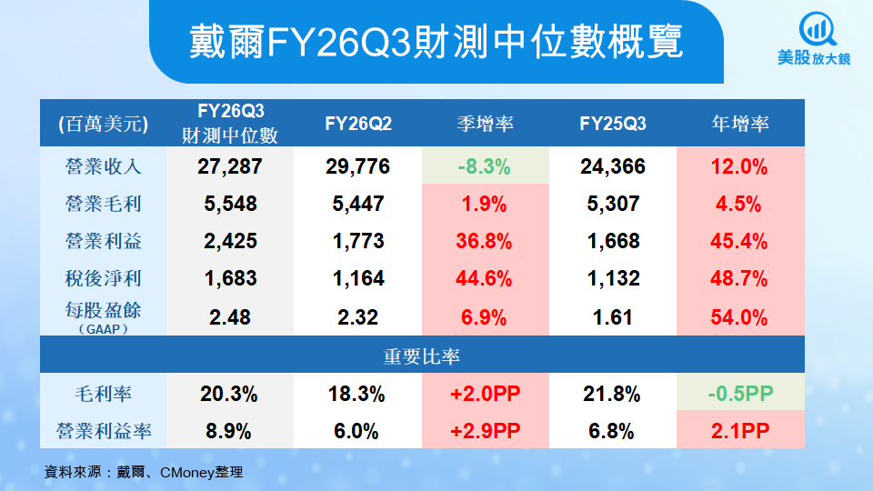 戴爾在上一季的財測中預估,FY26Q3 營收將落在 265 億至 275 億美元的區間。市場共識則約為 272.7 億美元,年增幅約 12%。GAAP EPS 為 2.48 美元,年增幅約 54% 之間。市場普遍認為戴爾在 FY26Q3 營收年增幅仍能維持雙位數成長,因為 AI 伺服器的訂單能見度高,且企業與主權客戶的 AI 投資仍在進行。然而,投資人更重視毛利與營業利益率是否回到更穩定的水準。若主要成長仍由高成本的伺服器構成,整體獲利品質可能仍未改善。
