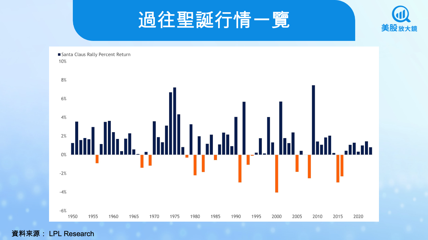 從統計角度來看,這段期間確實具備一定優勢。根據 Carson Group 的整理,自 1950 年以來,標普 500 指數在聖誕行情期間上漲的機率約為 78%,平均報酬約 1.3%。單看勝率,這個數字不低,也難怪市場每年都會再次聚焦於它。