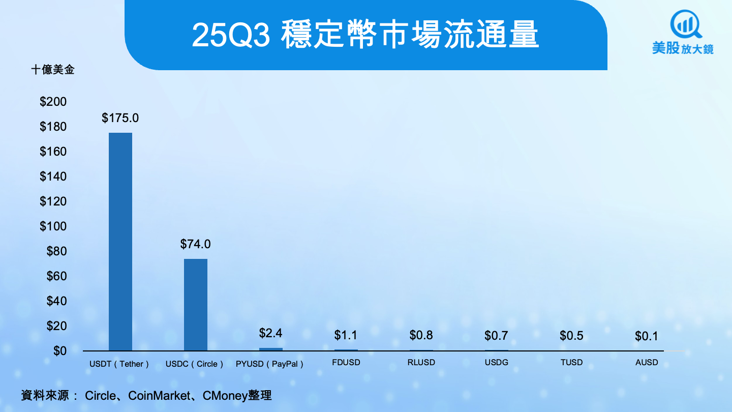 最新一季的穩定幣流通量顯示,USDT 以 1,750 億美元稱霸,而 USDC 以 740 億美元穩居第二。從第三名開始,市場規模直接崩塌──PayPal 的 PYUSD 只有 24 億美元,其他如 FDUSD、RLUSD、TUSD 更是只有一億美元級別,根本難以撼動雙巨頭地位。