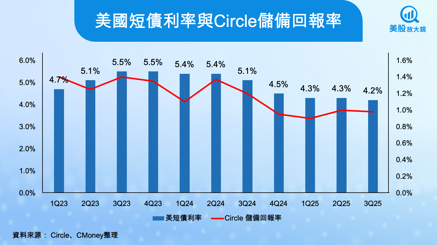 不過,投資人真正緊盯的並非這張亮眼成績單,而是它能否「持續」。美國短債利率在過去一年一路從 5.5% 高點滑落至 4.2%;Circle 的儲備回報率也同步下降。雖然美聯儲尚未正式啟動降息循環,但對 Circle 來說,利差壓力已經提前反映在數據上。對任何仰賴利率收入的機構來說,這通常代表著未來獲利將進入盤整期。