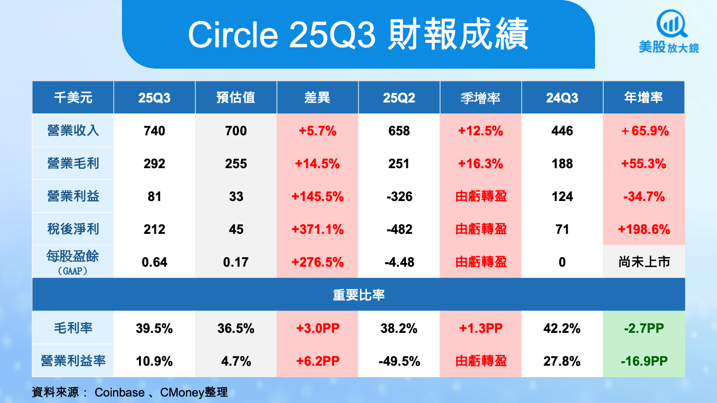 25Q3 Circle 交出 2.12 億美元的稅後淨利,較去年暴增近三倍,是自公司上市以來最亮眼的一季,營收 7.4 億美元、毛利 2.9 億美元、營業利益更從上季的虧損轉為 8,100 萬美元的實質獲利,全面超出市場預期。這不是一次性的巧合,而是 USDC 規模效應全面發酵的結果。