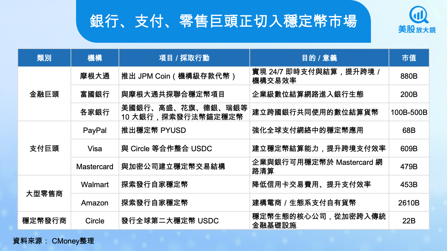摩根大通(JPM)用自家 JPM Coin 處理機構間支付;富國銀行(WFC)、花旗(C)、德意志銀行等大型銀行成立聯盟,探索銀行級穩定幣合作;Visa(V)與 Mastercard(MA)正在把 USDC 加入跨境結算協議;PayPal(PYPL)也推出 PYUSD,以支付網路的力量推動穩定幣普及。