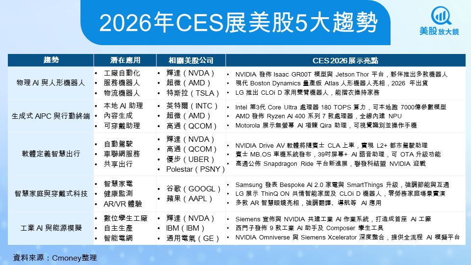 穿戴式科技則呈現另一條路徑。CES 2026 可明確看到,市場焦點正從「顯示型裝置」轉向「感知型助理」。無論是具備錄音、轉錄與摘要功能的 AI 穿戴裝置,或是結合視覺與語音理解的輕量化眼鏡,本質都在降低使用門檻,讓 AI 成為隨時可用的背景能力。這對蘋果(AAPL)、谷歌(GOOGL) 等擁有作業系統與生態優勢的公司尤其關鍵。只要 AI 能自然嵌入既有穿戴設備,健康管理、個人助理與情境式服務就有機會轉化為高黏著度的付費功能。從投資角度來看,智慧家庭與穿戴不一定帶來爆炸性單季成長,但它們決定了平台型公司的長期護城河,也將成為 AI 普及後最穩定、最難被取代的現金流來源之一。