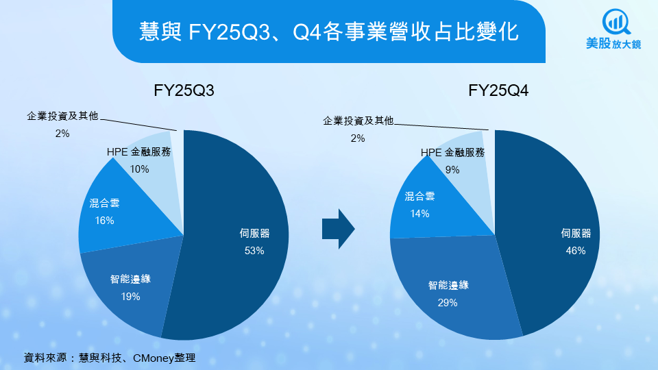 資料中心的建置速度在本季稍有遞延,使得 AI 伺服器出貨低於預期,但從訂單與 Backlog 的角度看,趨勢並未出現任何放緩。隨著 AI 基礎建設持續成長,慧與所處的位置將更加穩固,不僅在伺服器硬體端具備優勢,在網路與雲端整合上也能受惠。