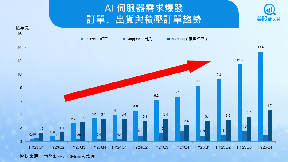 伺服器業務在本季雖然出現年減 5% 的下滑,但背後的故事更偏向「遞延」而非「衰退」。從 AI 伺服器的訂單數據即可看出端倪:本季 AI 訂單金額突破 134 億美元,積壓訂單更攀升至 47 億美元,均創下歷史新高。管理層指出,超過六成的 AI 訂單來自主權國家與大型企業,這類客戶的部署週期較長,但一旦展開,往往具備持續擴建的需求,也讓伺服器業務出現更長線的動能。