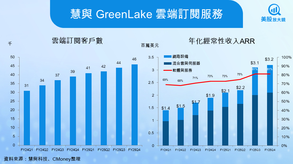 GreenLake (「隨需應變」雲端平台服務)的成長同樣象徵慧與轉型的成功。雲端訂閱服務的企業用戶數從去年同期的 39,000 家增加至 46,000 家,呈現穩健且持續的擴張。更重要的是 ARR 的規模,本季已達 32 億美元,年增 63%,且成長主要來自軟體與服務,而非硬體租賃。隨著越來越多企業採用混合雲架構,GreenLake 能提供成本可預期、依需求擴張的方案,同時整合網路、伺服器與儲存設備,形成高黏著度的營運中心。