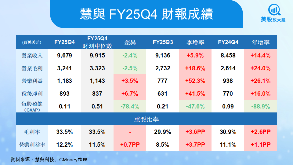 從 FY25Q4 的財報結果來看,慧與的體質正在加速強化。本季營收達 96.79 億美元,較去年同期成長 14.4%,創下歷史新高;營業毛利提高至 32.41 億美元,年增幅達 24%,反映高毛利業務在公司整體營收中的占比持續上升。營業利益也同步提升至 11.83 億美元,年增 26.1%,營業利益率因此上升至 12.2%,比去年多了 1.1 個百分點。在強勁獲利的推動下,稅後淨利達 8.93 億美元,比去年成長 16%。唯獨 GAAP EPS 因併購與重組費用影響降至 0.11 美元,與去年相比大幅縮減,不過屬一次性影響,並未改變本業走強的趨勢。